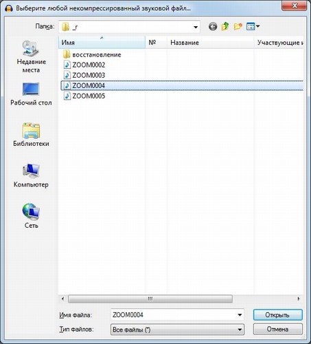Для этого необходим рабочий файл с предположительно такими же настройками. Поскольку до файла рекордер нормально записал файл "ZOOM0002, то будем использовать его в качестве исходного образца.