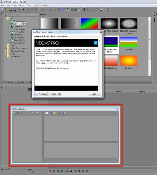 XDCAM Explorer позволяет вам качественно импортировать свои видео клипы в ваш проект. Импортированные клипы отображаются в окне, так что вы можете просмотреть их, прежде чем бросать их на таймлайн. Для получения дополнительных сведений об использовании XDCAM Explorer окно, щелкните здесь, чтобы открыть интерактивную справку. Нажмите кнопку Next, чтобы продолжить.