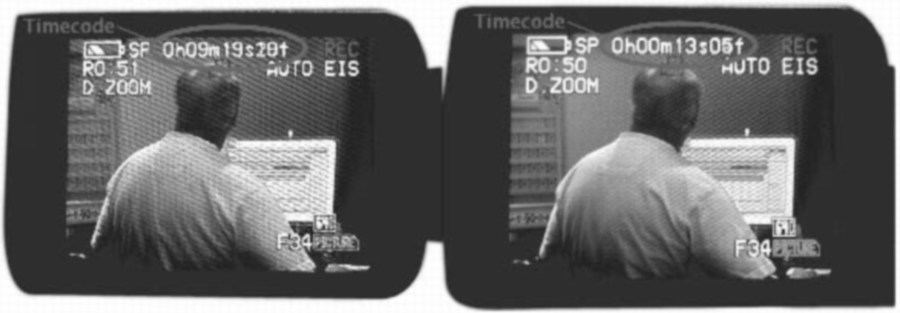 Чтобы определить, имеете ли вы дело с регенерацией временной кодировки, посмотрите на текущую кодировку кассеты в видоискателе камеры. Например, если вы записали 10 мин материала, а затем выключили и включили камеру, но при этом счетчик кодировки показывает 00:00:00;00, это значит, что вы имеете дело с регенерацией временной кодировки. На рис. 1 показано, как выглядит временная кодировка на LCD-мониторе до (слева) и после (справа) выключения камеры.
