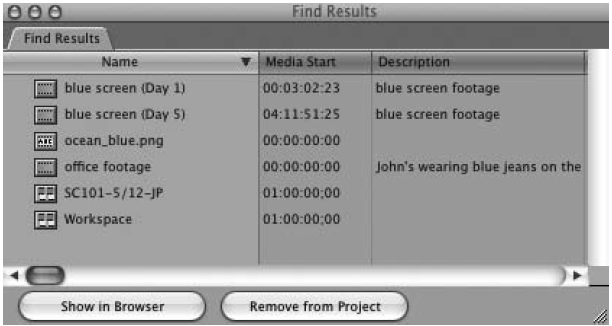 Если вы нашли снимок в таблице и хотите просмотреть соответствующий материал в вашей системе монтажа, вы можете без труда его найти, потому что таблица автоматически выполняет совмещение данных. Если у вас нет доступа к таблице, вы можете выполнить поиск в проекте и получить аналогичный результат. На рис. 1 показано диалоговое окно Find (Найти) для приложения Final Cut Pro, а на рис. 2 - результат.