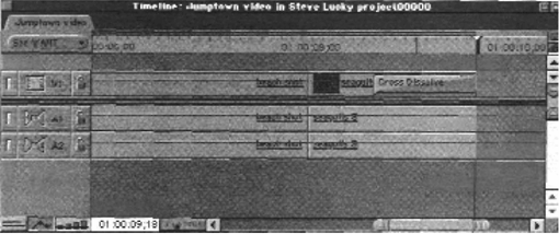 Эффекты, применяемые к клипу на видеотреке V2 или выше, скорее создают переход между клипом и прозрачностью, чем между клипом и чернотой. Это значит, что если вы работаете по безподрезочной схеме с двумя клипами, соединенными в конце вашей последовательности и вы применяете перекрестный наплыв на клипе V2, чтобы создать эффект ЗТМ (Картинка 5.80), вы скорее будете постепенно раскрывать клип на треке V1 по ходу развития эффекта.