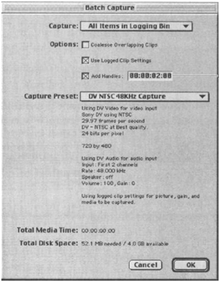 Единственная проблема, которая может возникнуть с захлестами, это то, что Final Cut Pro ждет пару секунд до и после захвата каждого клипа, перед тем, как на самом деле начнет этот захват производить. Это значит, что вы не можете с чувством полной безопасности выставлять In ранее, чем за 5 секунд до нужного вам места и Out позже, чем за 5 секунд после его конца. Так как большинство людей расписывают кассету до последнего клипа, использование захлестов по умолчанию может перенести Out-кадр последнего плана на кассете за ее конец, что вызовет ошибку при попытке захватить клип.